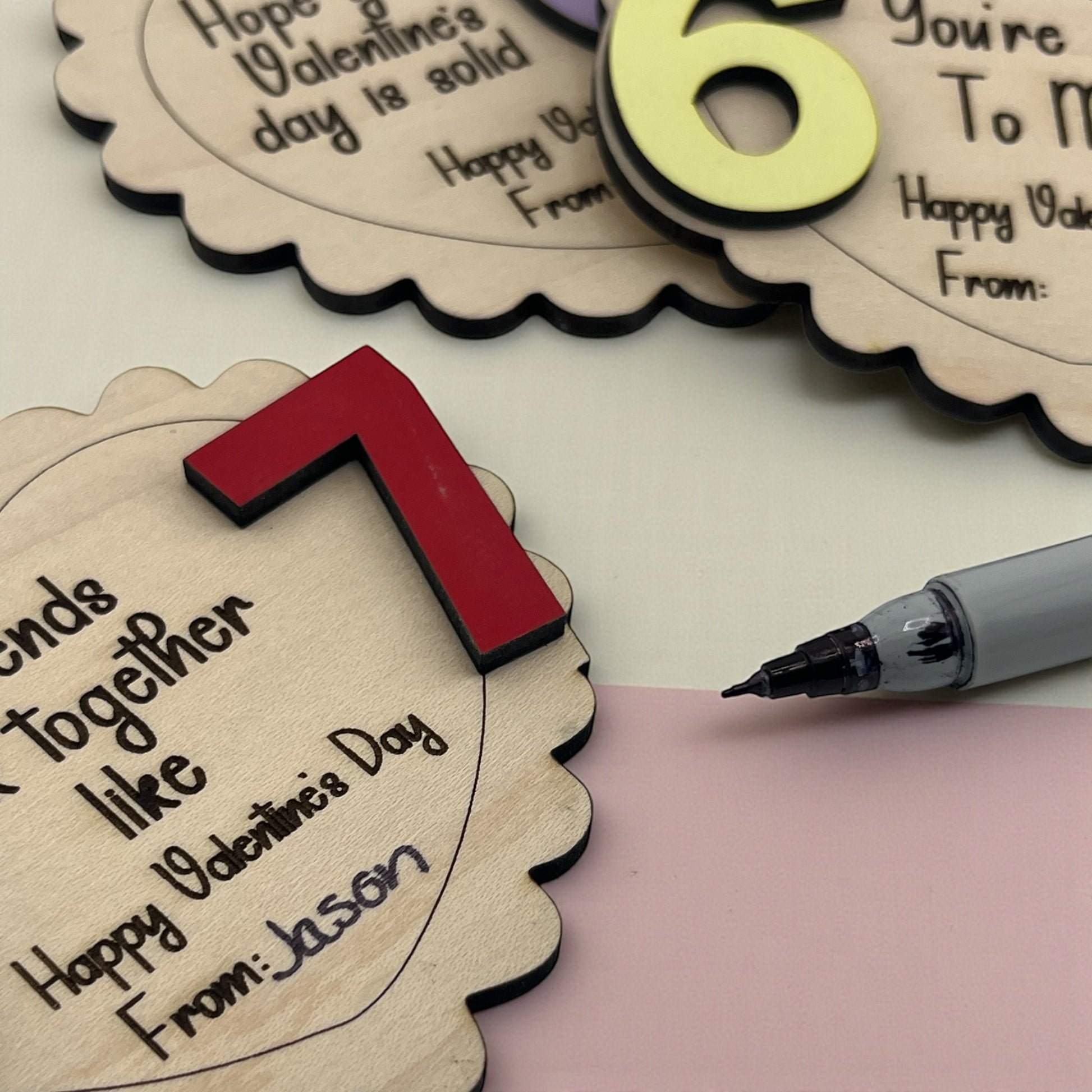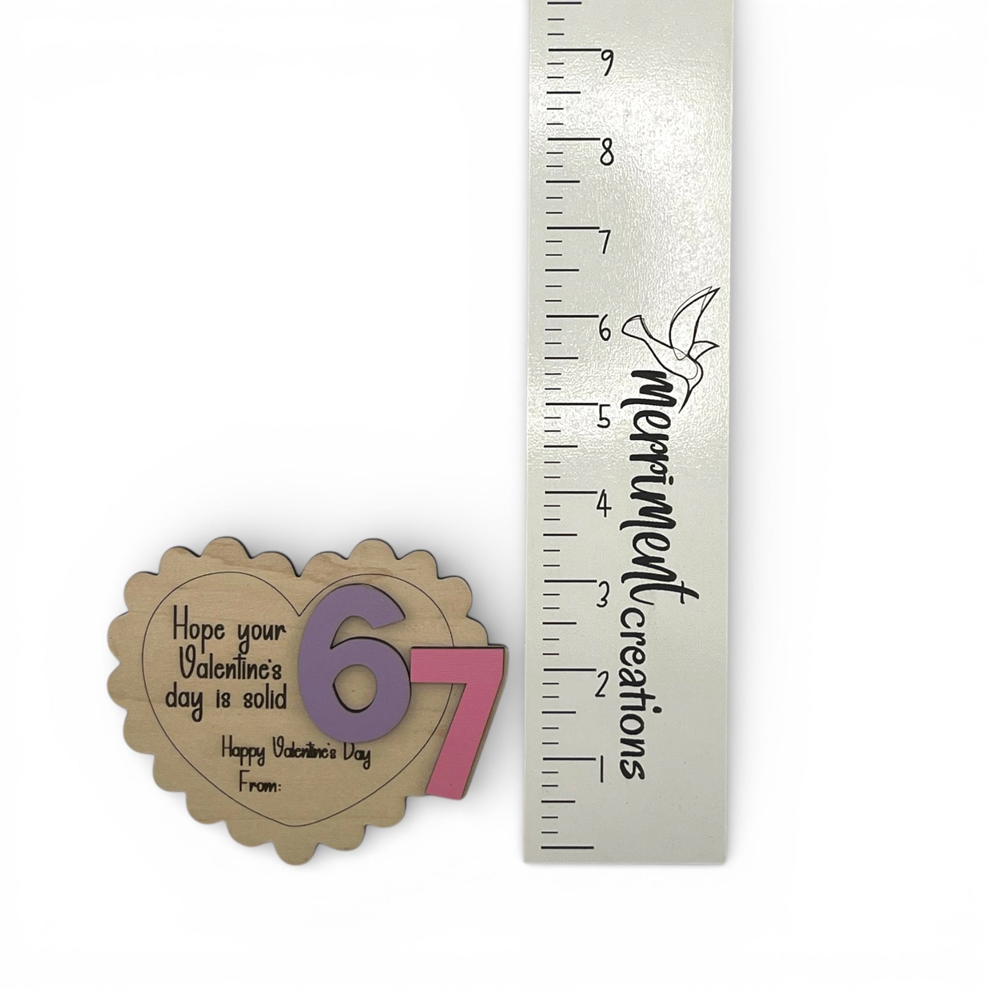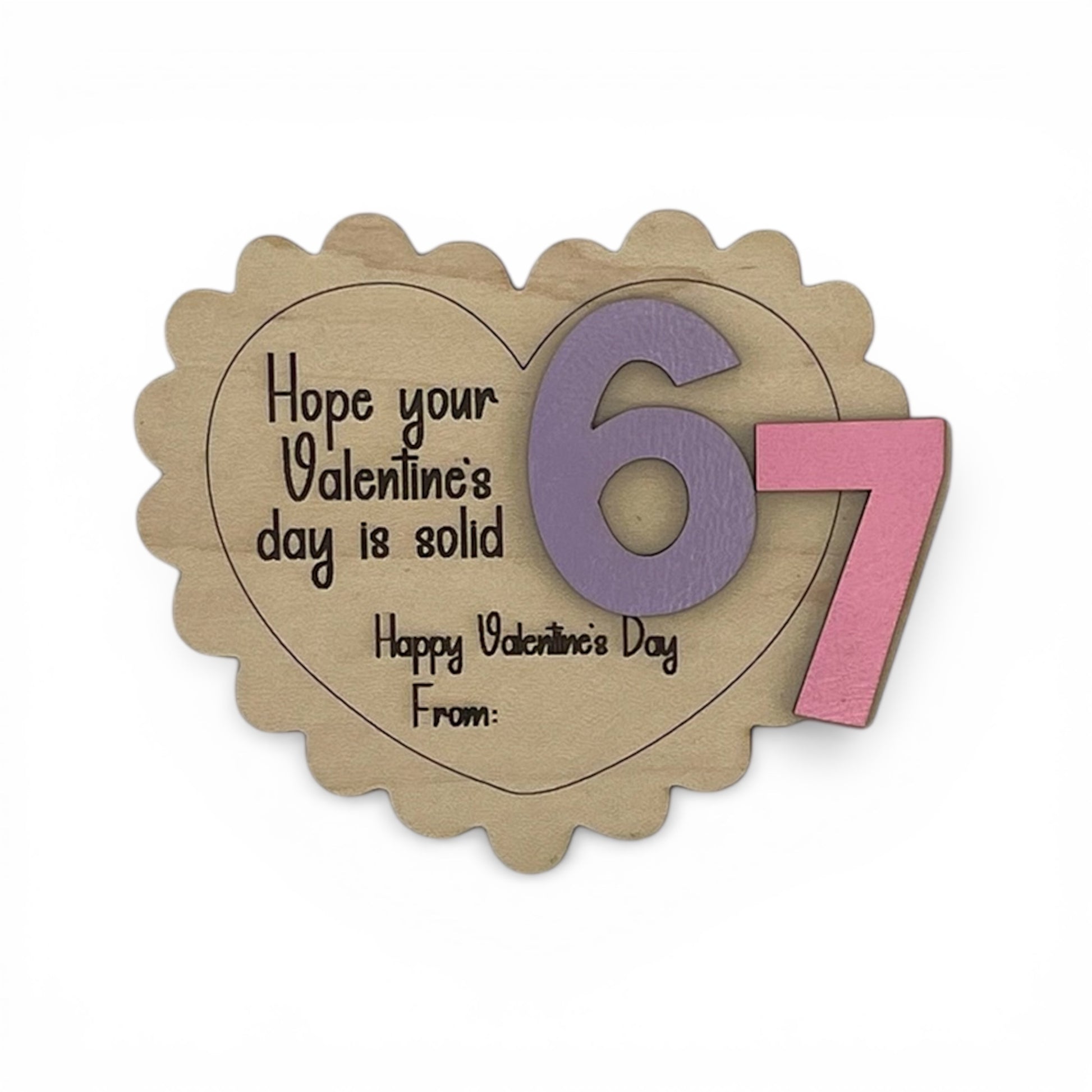 These Valentines add a clever twist to Valentine’s Day. Each wooden Valentine features a playful phrase built around their favorite numbers- 6 7 - in a variety of colors.
