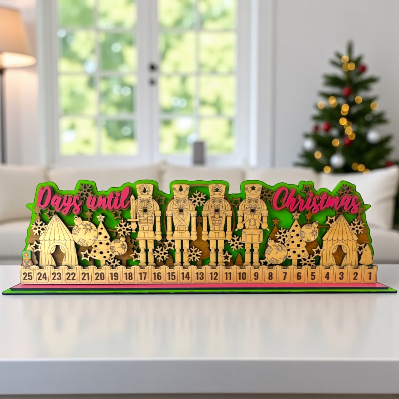 Bring the joy of the season to life with this Nutcracker Countdown Stand! A parade of nutcrackers and holiday ornaments pops against a bright green background with bold fuchsia lettering, while a nutcracker head marker helps you count down the days until Christmas.