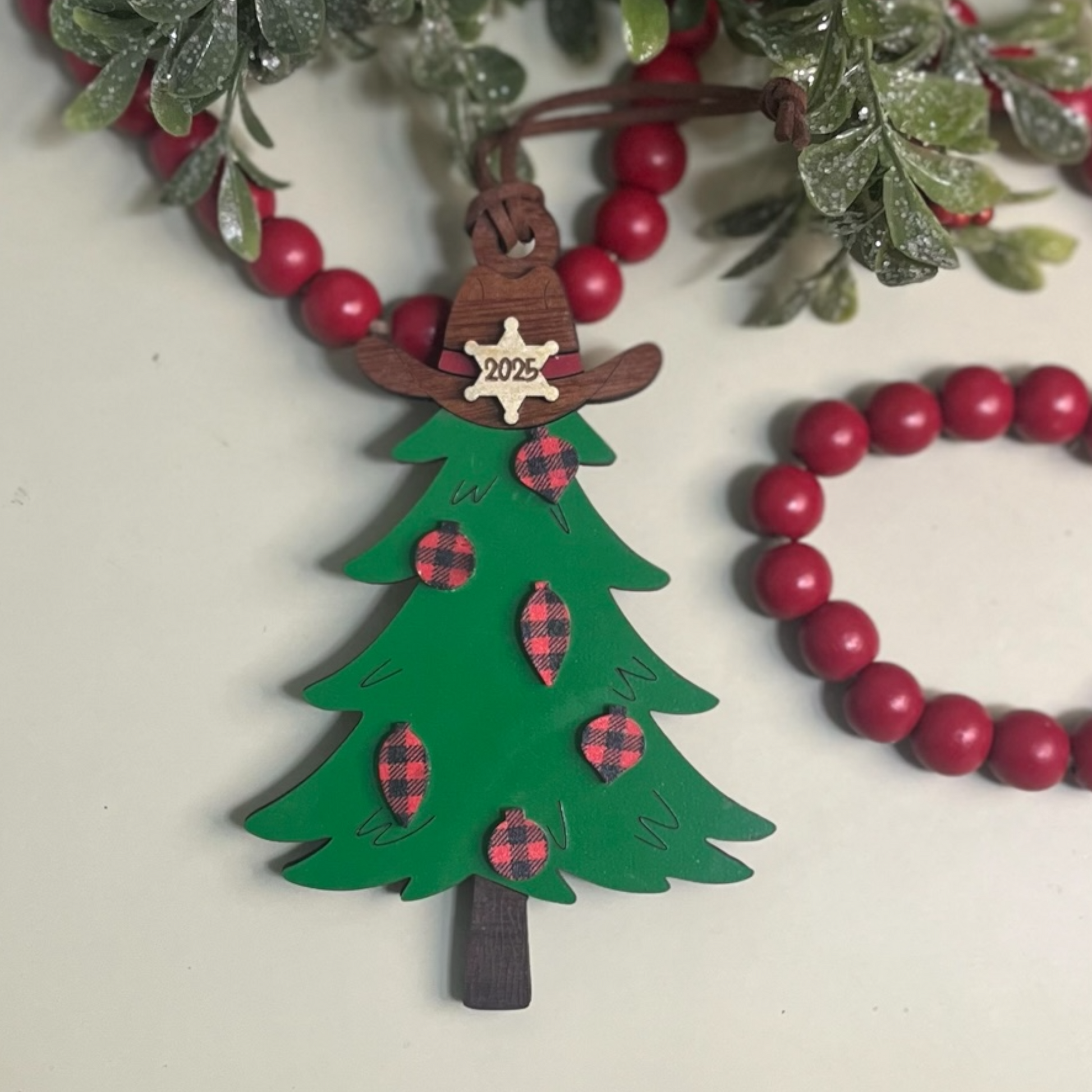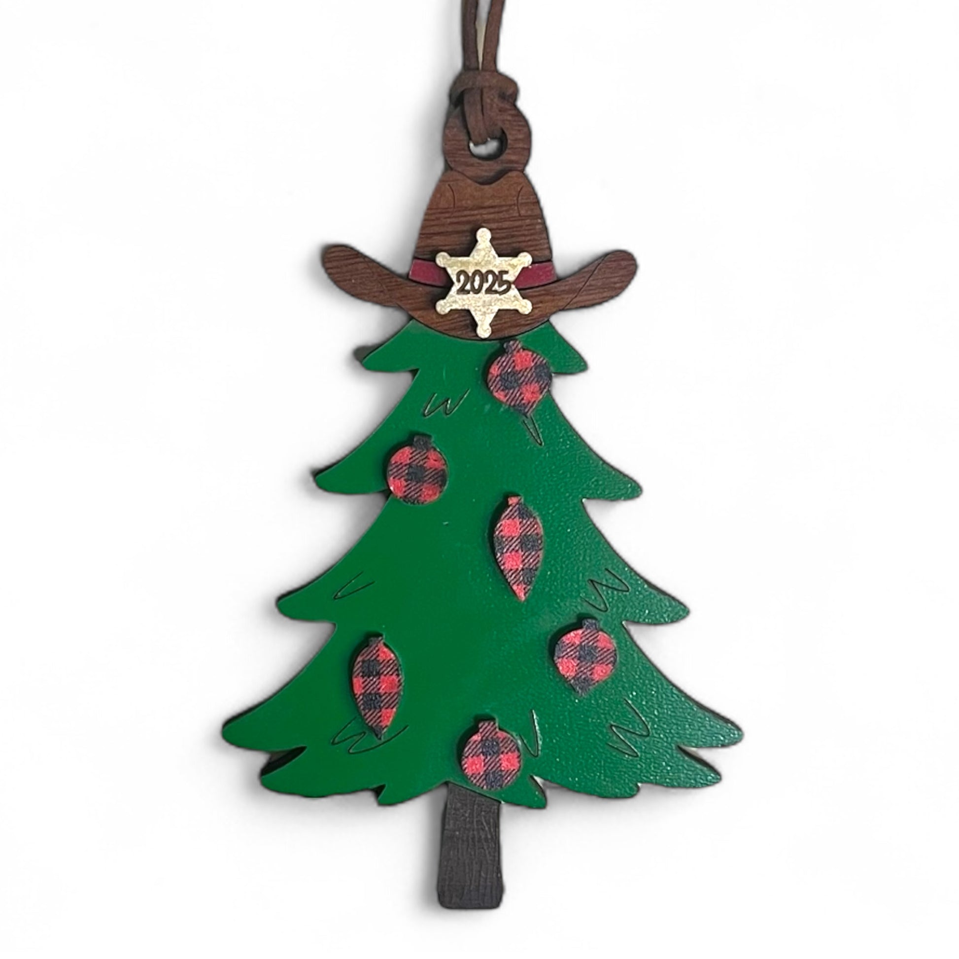 Bring a little wild west cheer to your holiday season with this fun and festive cowboy Christmas ornament! This handmade wooden ornament features a green Christmas tree adorned with red-and-black buffalo plaid “ornaments,” topped with a cowboy hat and gold sheriff’s star engraved with 2025. It’s the perfect keepsake for ranchers, rodeo fans, or anyone who loves a western twist on classic Christmas decor.
