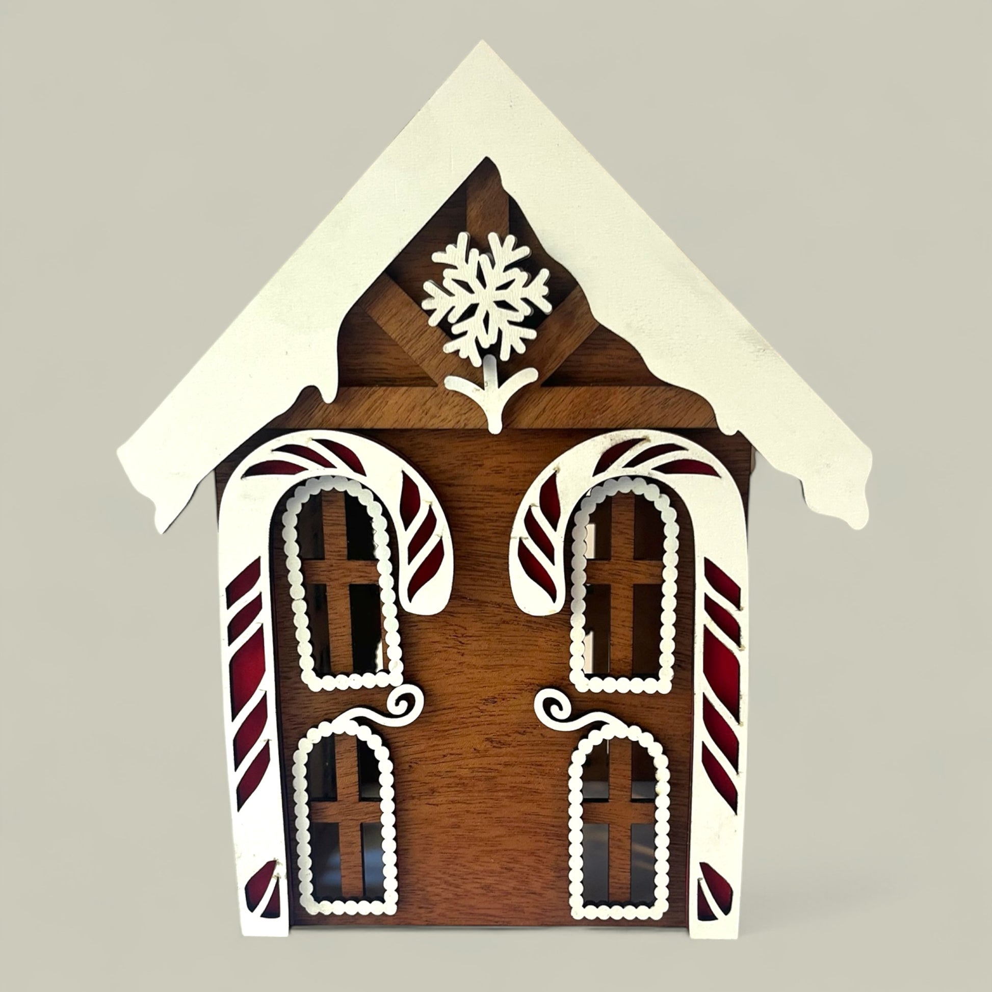 Bring a touch of sweet nostalgia to your holiday decor with our Classic Gingerbread House! This festive tabletop piece features a rich wood base with crisp white “icing” accents and charming red-and-white candy canes for that timeless Christmas bakery look.