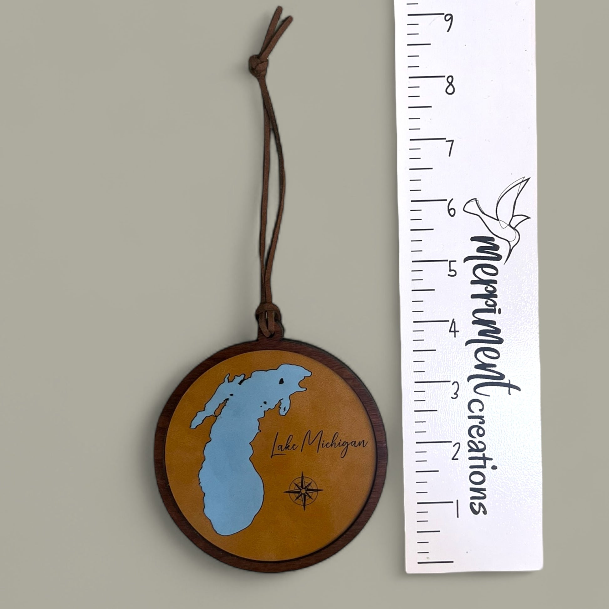 Celebrate your love for the Great Lakes with this Lake Michigan Ornament, featuring supple leatherette with a sturdy wood frame. The soft blue silhouette of Michigan sits against a warm tan background with “Lake Michigan” and a compass graphic etched into the surface — a nod to adventure, travel, and home by the water. Perfect for Great Lakes enthusiasts, campers, or anyone who treasures Michigan’s natural beauty, this ornament adds timeless charm to any Christmas tree or year-round display.