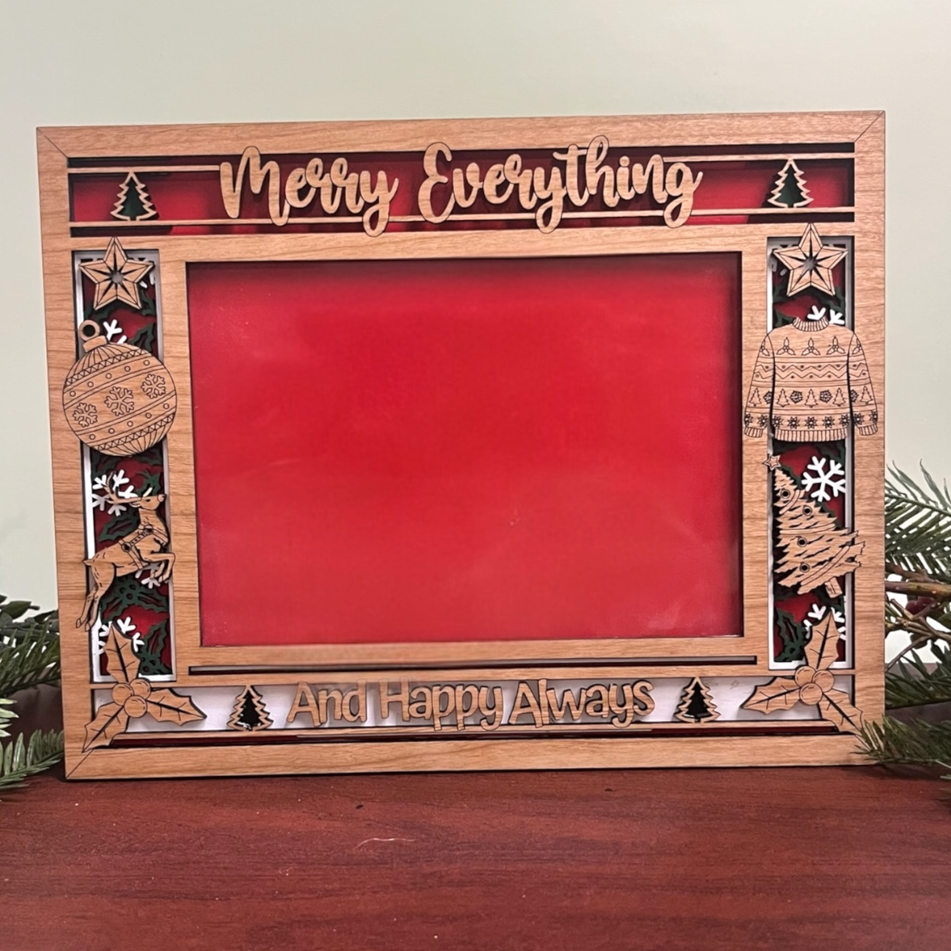 Celebrate the most wonderful time of the year with this festive holiday picture frame! Featuring detailed engraved icons surrounding the cheerful phrase “Merry Everything and Happy Always,” this frame perfectly captures the warmth and joy of the season.