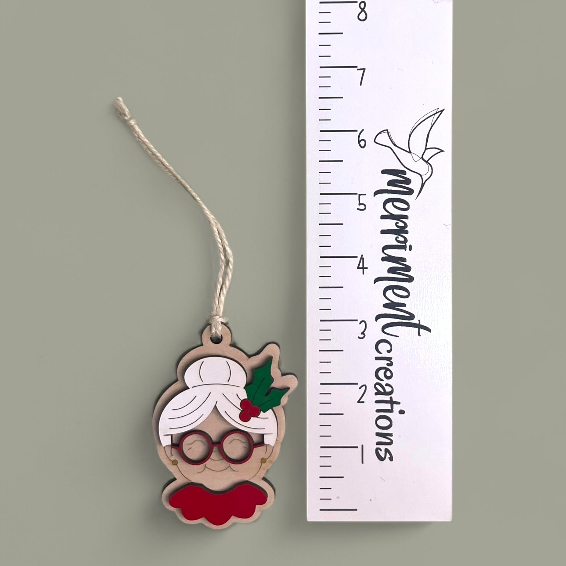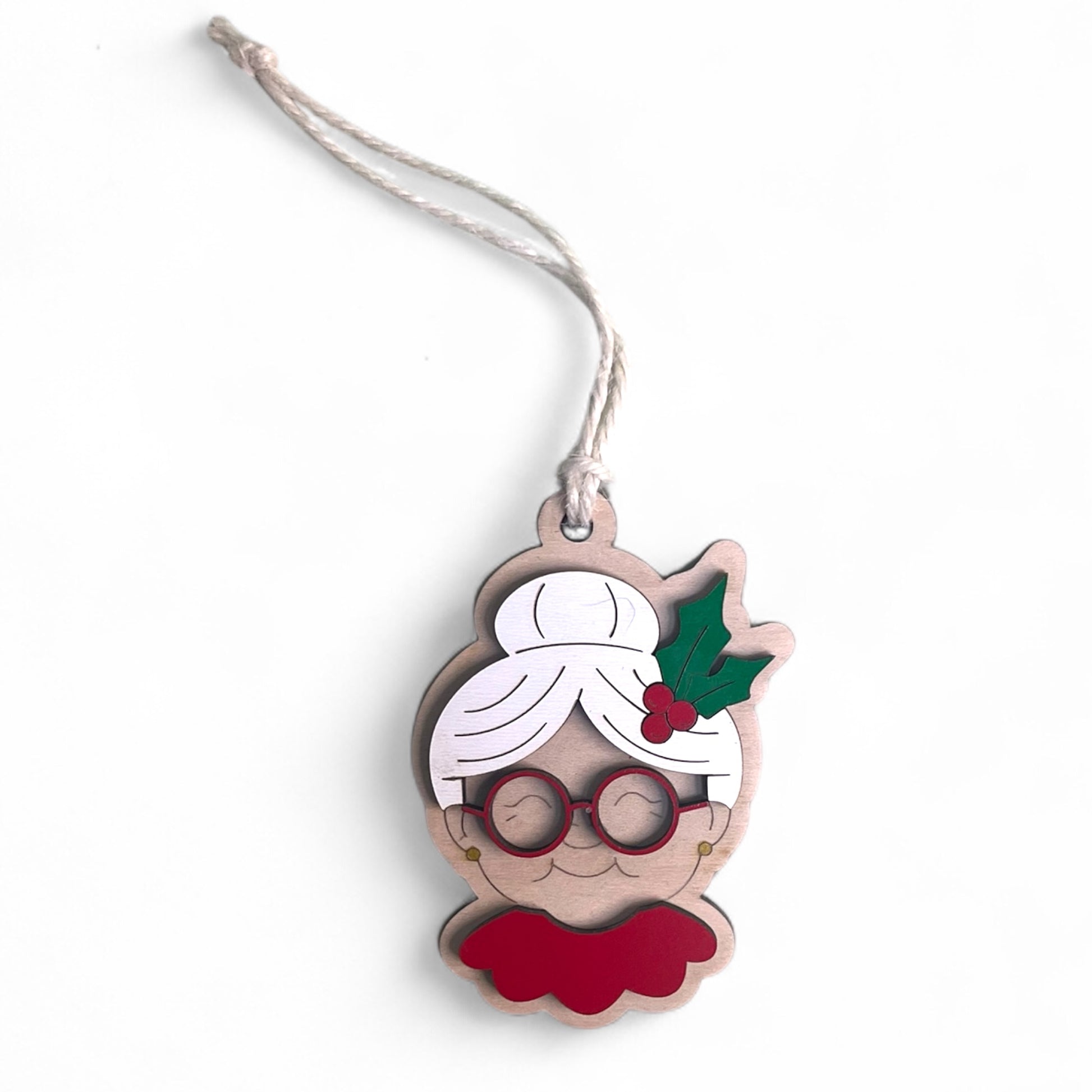 Add a touch of sweetness and holiday charm with this Mrs. Claus Wooden Ornament. Featuring her classic red glasses, cozy smile, and a sprig of holly in her hair, this cheerful ornament brings warmth and nostalgia to any Christmas tree. Handcrafted from layered wood and painted in festive colors, it’s a perfect gift for grandmas, bakers, or anyone who loves a touch of whimsy in their decor.